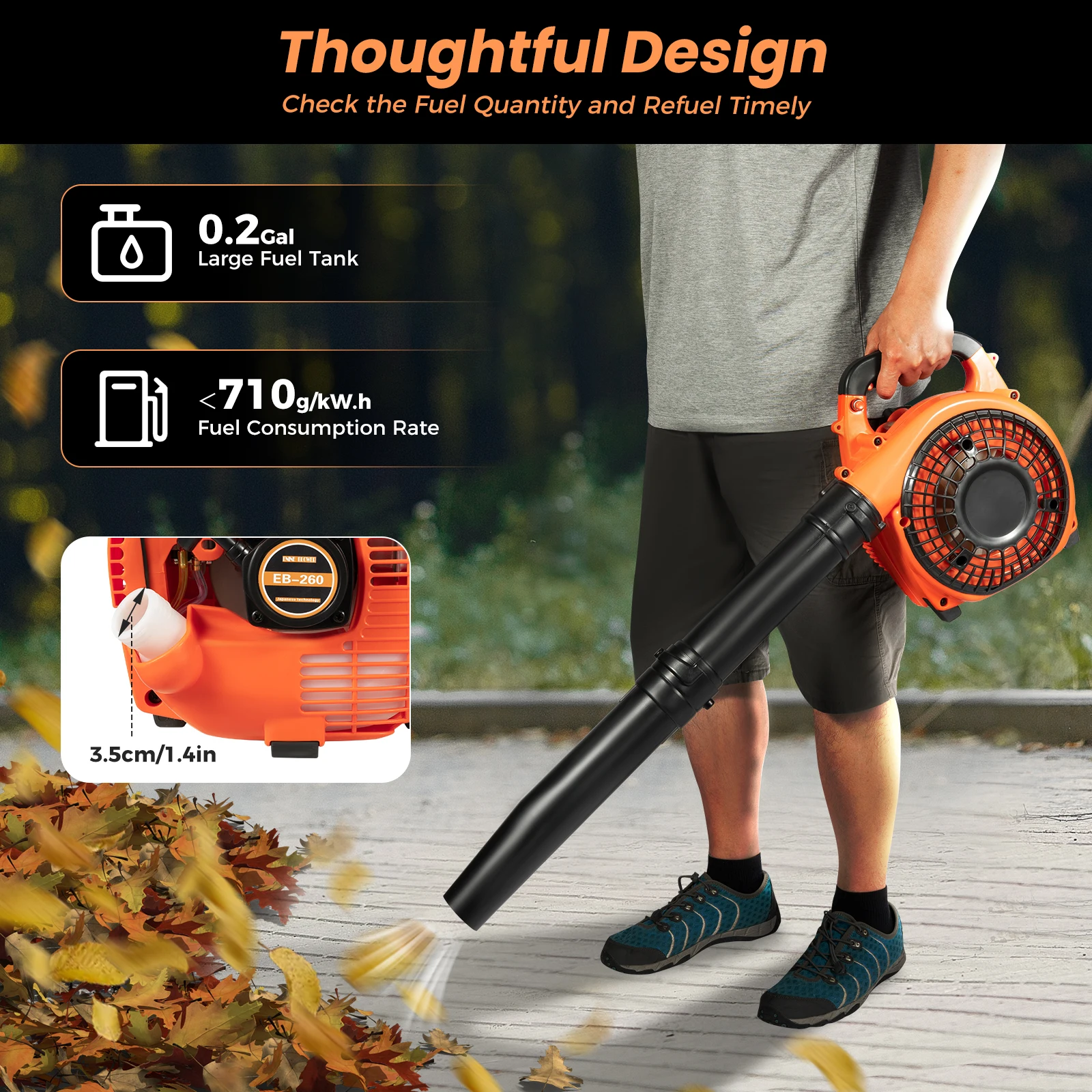 Efficient Blowing:Its 0.75kW/7500rpm strong power can reach 7000rpm impeller speed and 0.13m³/s airflow capacity, which can quickly remove leaves, rubble, snow, dust and put out a fire, improving your work efficiency.