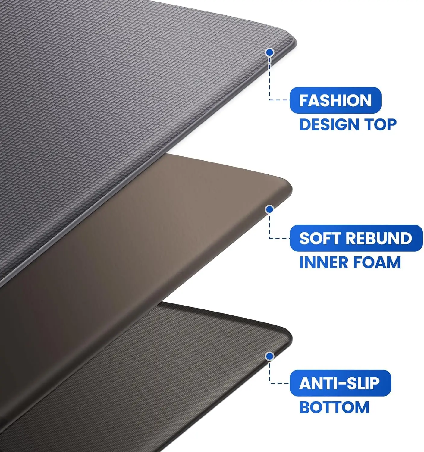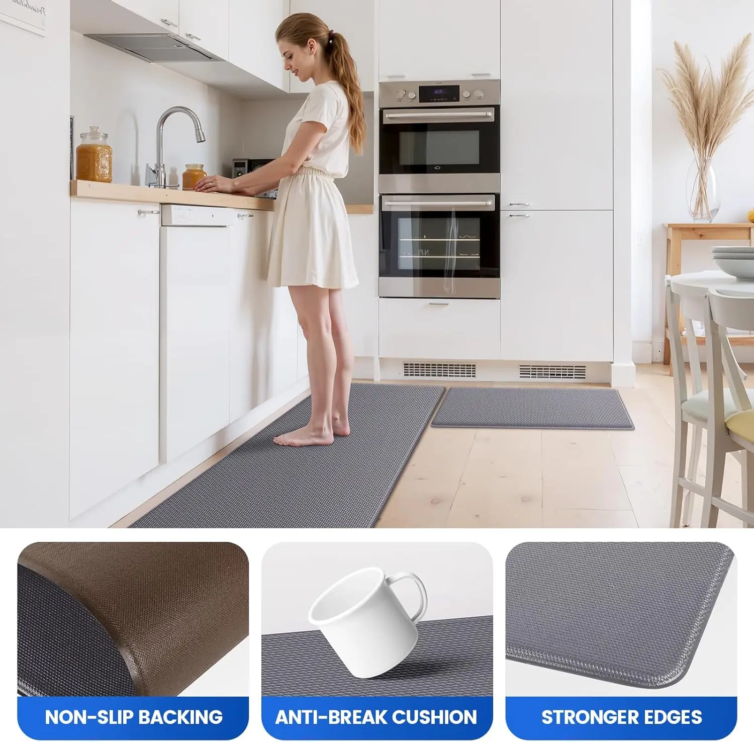 Enhance your kitchen and office spaces with our premium floor mats designed for comfort, safety, and durability. Key features include: 1. **Non-Slip & Anti-Fatigue Design**: These mats provide a secure grip to prevent slips and falls in wet or busy areas like kitchens. The cushioned surface reduces foot fatigue, making them ideal for long hours of standing while cooking or working in an office setting. 2. **Waterproof & Easy to Clean**: Made from high-quality materials that resist water absorption, these mats protect your floors from spills and stains. Simply wipe clean with a damp cloth or mild detergent for hassle-free maintenance. 3. **Comfortable Cushioning**: The thick padding offers excellent support and comfort underfoot, helping to alleviate pressure on joints during prolonged use in kitchens or offices. 4. **Versatile Use**: Perfect for placement in front of sinks, stoves, workstations, or any high-traffic area where you need extra protection and comfort. The neutral grey color blends seamlessly with various decor styles. 5. **Durable Construction**: Built to withstand daily wear and tear, these mats are long-lasting and retain their shape over time without flattening out. 6. **Set of 3 Pieces**: This value pack includes three mats, allowing you to cover multiple areas at once or have spares ready when needed. Upgrade your home or workspace today with these reliable floor mats that combine functionality with style.