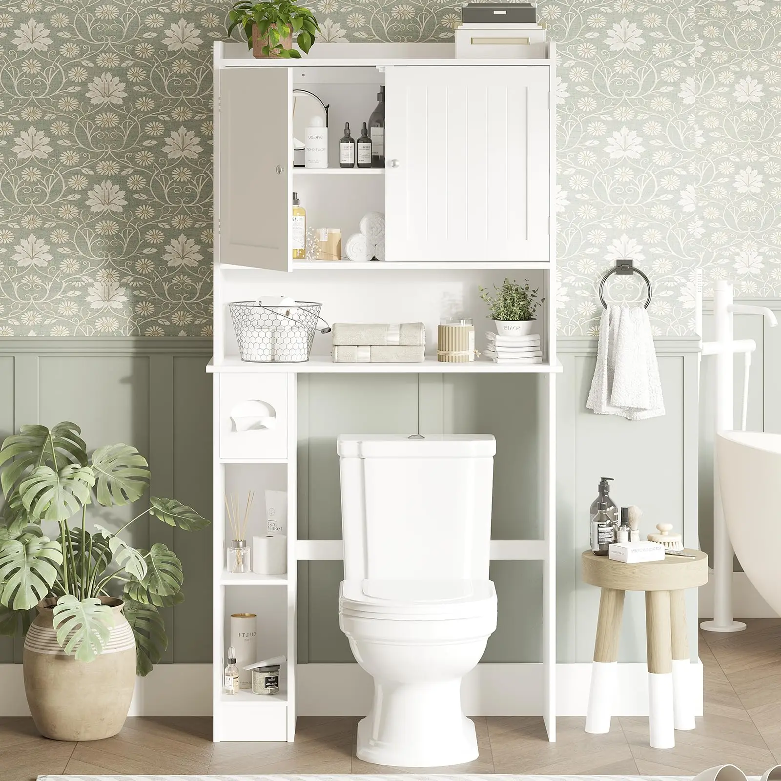 Perfect for small bathrooms! It fits snugly over your toilet to transform unused wall space into valuable, easy-to-reach storage for toiletries, towels, and more.