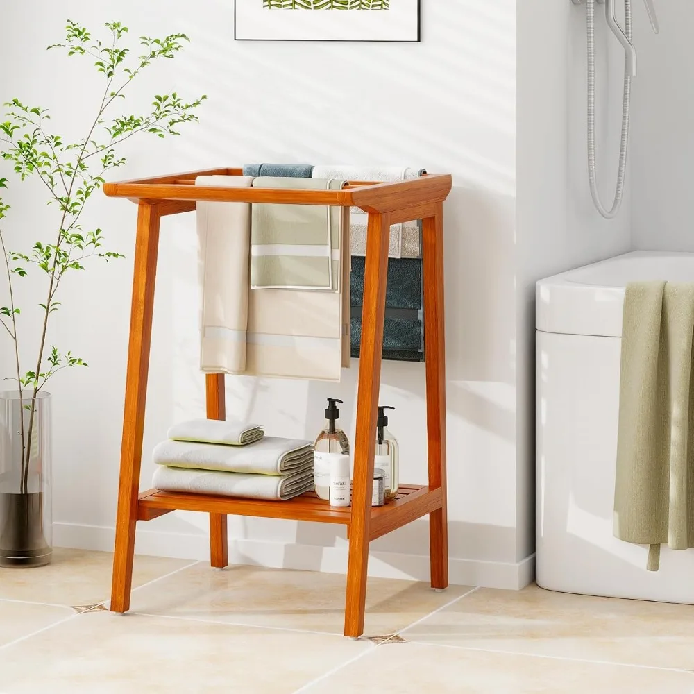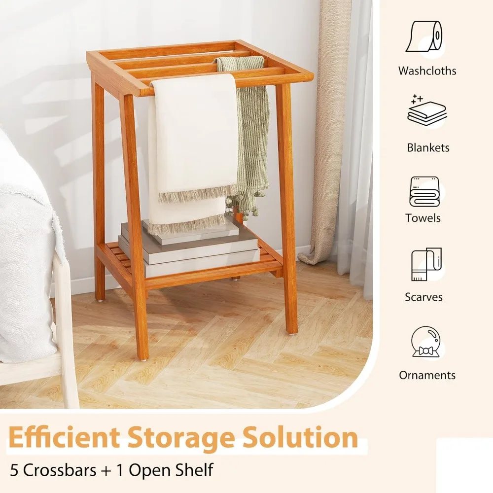 Freestanding Teak Bathroom Towel Rack with 5 Bars and Storage Shelf for Shower and Clothing