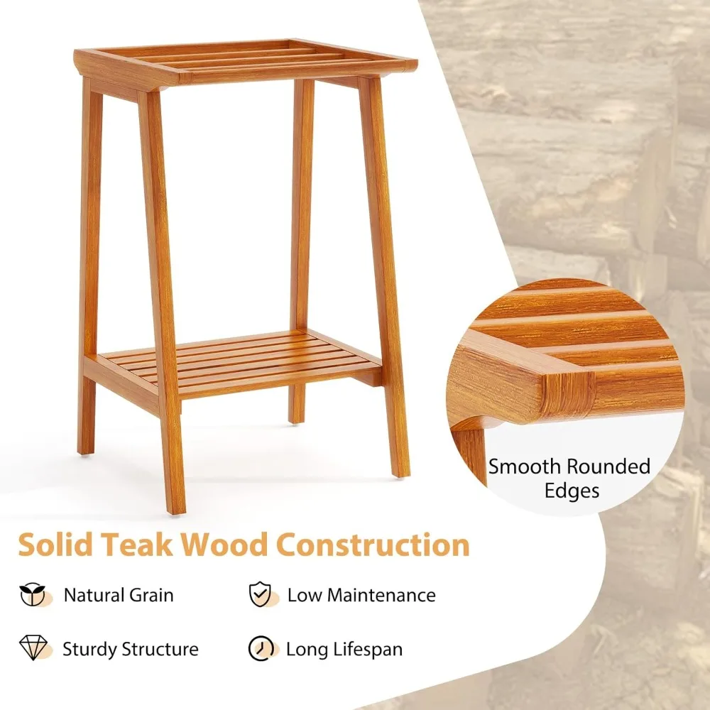 This product is a high-quality towel rack made from solid teak wood, which is known for its strength and low maintenance requirements. It is designed for both indoor and outdoor use, but it should not be exposed to rain or left outdoors for extended periods. The rack features five bars and an open shelf, providing ample space for hanging towels or blankets and additional storage for bath essentials, swimming gear, or decorative items. With its multifunctional design, this freestanding rack can also serve as a blanket holder or a display rack, measuring 19.5 inches in length, width, and 31.5 inches in height. The natural wood grain of the teak adds a touch of elegance and warmth to any room, making it suitable for bathrooms, living rooms, poolside, or laundry rooms. Assembly is straightforward, with clear instructions provided, and the rack is easy to maintain, requiring only a damp cloth for cleaning.